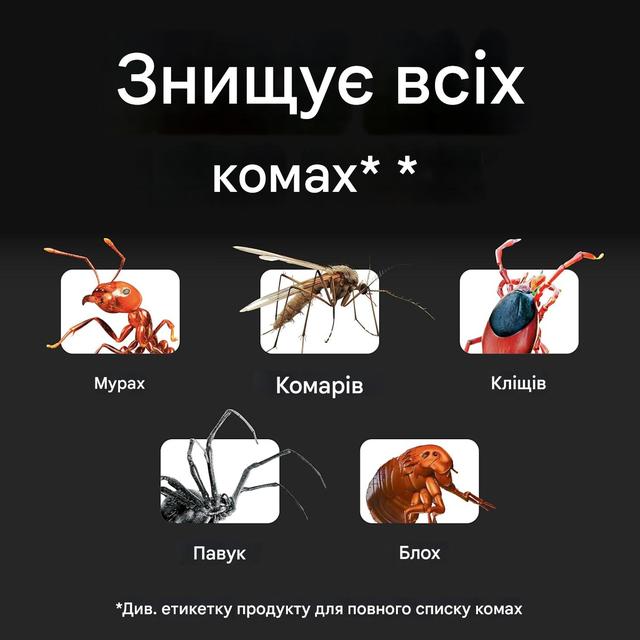 Вбиває мурах, кліщі, павуки, блохи, ведмедики, пшеничні лопухи та багато інших занесених і тих, хто прийшов на Ваш газон, ділянку.
